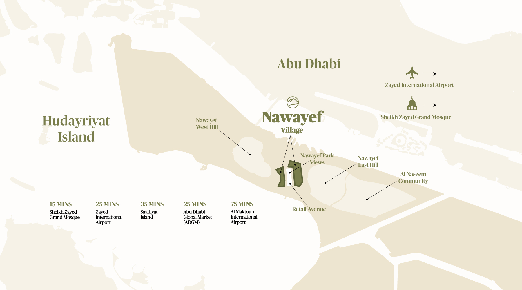 Set between the West and East Hills of Hudayriyat Island, Nawayef Village is a gated community where Tuscan-inspired homes meet everyday convenience. This vibrant neighbourhood offers three to five-bedroom townhouses and twin villas, all surrounded by green spaces and close to lively retail, dining, a boutique cinema and more. With parks, schools, a health centre and the beach just minutes away, it’s a place where life flows effortlessly.